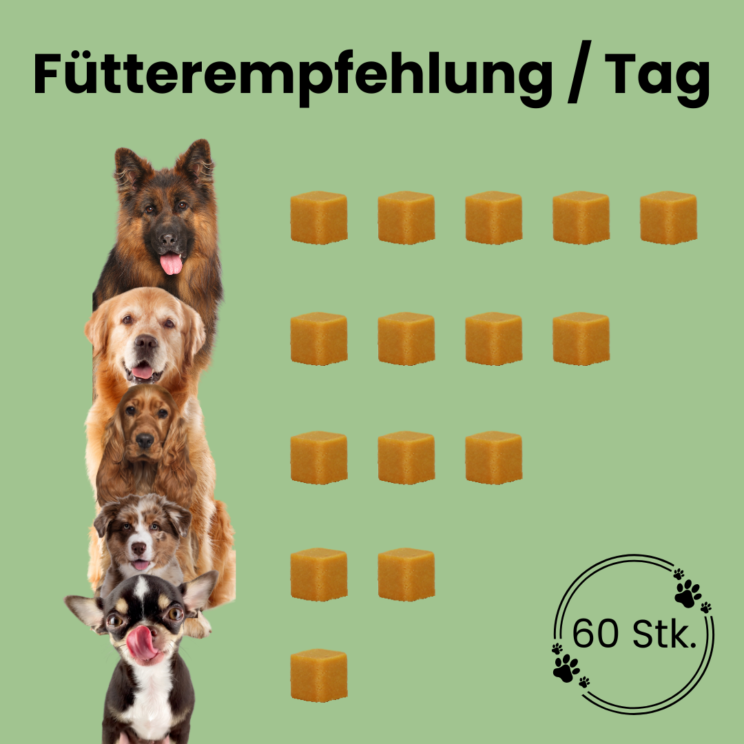 Wir empfehlen zwischen den einzelnen Kausnacks 4-5 Stunden Zeit zu lassen, damit jeder einzelne Kausnack seine volle Wirkung entfalten kann.